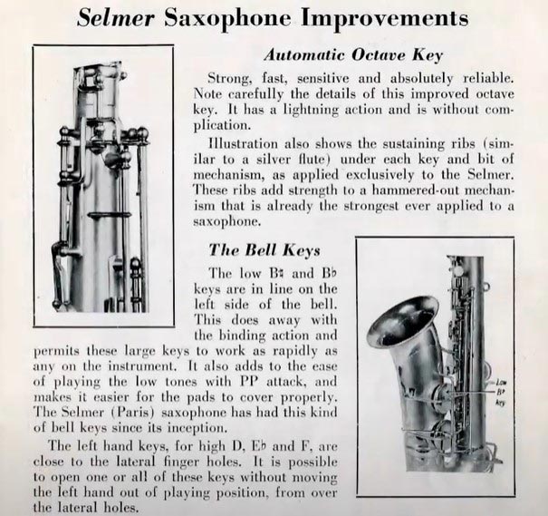 L’introduction de la clé d’octave automatique a ainsi grandement simplifié le jeu des saxophonistes en leur permettant de changer d’octave plus facilement et plus rapidement, en appuyant simplement sur une touche sans avoir à utiliser une autre clé d’octave séparée. Henri Selmer avait donc pensé et ajouté une clé d’octave automatique pour améliorer la justesse et la réponse de l’instrument en permettant une transition fluide entre les registres grave et aigu du saxophone. Très novateur pour l’époque, le Modèle 22 séduisit rapidement les musiciens et fut alors produit en une gamme complète d’instruments, comprenant un sopranino, un soprano droit en ut, un soprano courbé en si bémol, un alto, un ténor en ut (C Melody), un ténor en si bémol, un baryton et un basse.