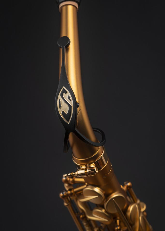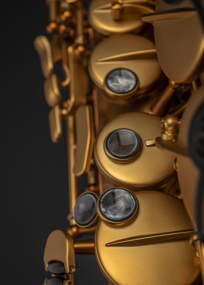 The Supreme Modele 2022 was conceived as an exceptional piece and manufactured with attention to every detail – some parts are gold plated and it includes a small medallion in grenadilla, also known as ebony from Mozambique. It features a contrasting matte gold finish with black on the guards, the medallion, the stamps and even the mother-of-pearl. In addition to the inclusion of precious materials, the instrument is particularly remarkable for its unequalled sound qualities. Indeed, in 2021, Selmer Paris redesigned the saxophone by creating the Supreme alto, after more than 10 years of research and experimentation carried out alongside musicians.