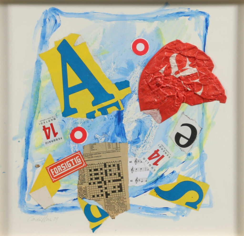Simon de Cardaillac also cut out pages from newspapers for his collages or to extract individual letters from them. The use of type-font in his works served to explore the expressive possibilities of the written language and numerical symbols. By incorporating these letters and numbers, and sometimes entire sentences, Simon added different levels of interpretation and meaning to his creations, and proposed a dynamic interplay between the visual and the verbal. By deconstructing words and numbers, isolating them, fragmenting them, or combining them in unconventional ways, he examined their structure, meaning and sound. Finally, he used them to create interesting visual patterns and add a tactile dimension to the medium.
