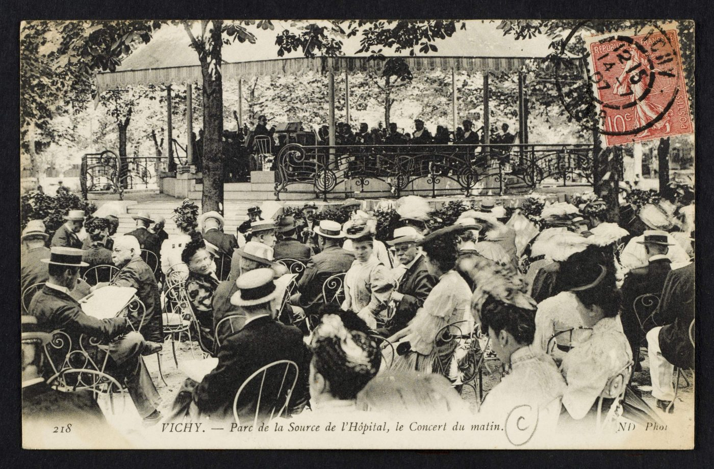 Le Parc des Sources de Vichy, aménagé progressivement dès le XVIIIe siècle et transformé en véritable promenade thermale sous Napoléon III, devint rapidement le cœur mondain de la station. Pour satisfaire une clientèle fortunée et cosmopolite, la Compagnie fermière de Vichy (CFV) – société concessionnaire chargée de gérer les sources et équipements thermaux – dota le parc d’aménagements confortables, dont un abondant mobilier de plein air. Dès la fin du XIXe siècle, des chaises furent mises à la disposition des curistes le long des allées et autour du kiosque à musique, en complément des bancs fixes[1]. Au départ, ce service était payant (un garde-chaises louait les sièges à la journée ou à l’heure, avec possibilité d’abonnements saisonniers) avant de devenir gratuit au cours du XXe siècle, suivant l’exemple des jardins parisiens[2].